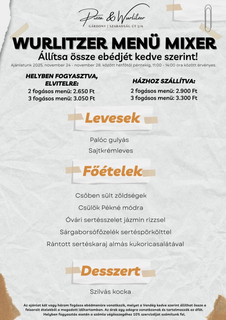 November 24 – 28. között az alábbi WURLITZER MENÜ MIXER étlappal várjuk Önöket hétköznap 11:00 – 14:00 óra között.
